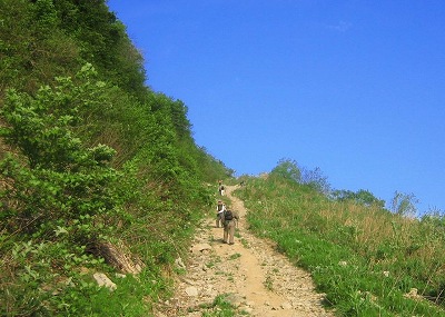 | 標準タイムの合計は山頂まで休憩無しで3時間20分 さて、シニアの我々はいったい何時間かかるのでしょう??? なにはともあれ、先ずは石ころだらけのゲレンデをノロノロ登ります でも、早くも汗が! 日陰が無いので夏場ならここでバテるだろうなぁ~? と云いながら チョッといっぷく 汗を拭うと五月の風が心地よい ・・・ |