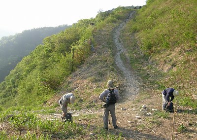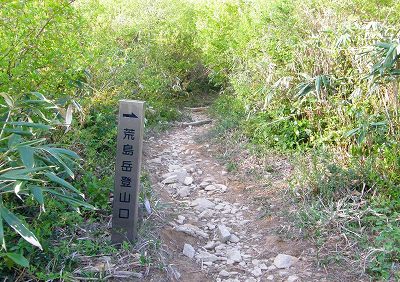 | 先ほどから右足の膝の外側に痛みが走るのが気になります この痛みは前回の登山から始まりました 膝付近の腸脛靱帯あたりが炎症をおこしているようです 所謂、<使い痛み>だと思うのですが ・・・ 「この分だとテッペンまで登るのはチョッと無理かも?」 と、不安がよぎる 膝をかばいながらモタモタ登る私を夫婦登山者が追い抜いていきます 先を行く仲間の姿はもう見えません! |