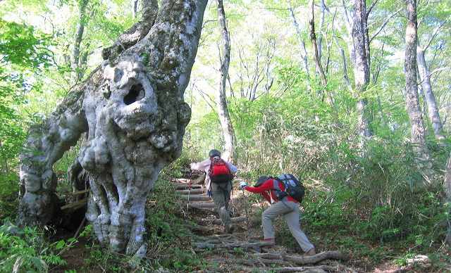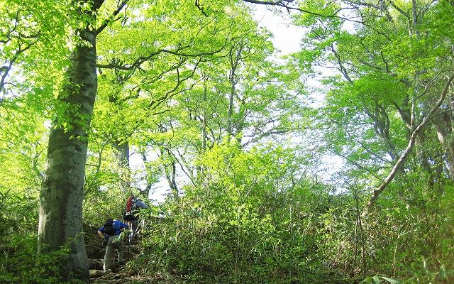 | 15分ほどの長い休憩のあと出発 (6時45分) 山道に入ったとたんブナの清々しい林となりました でも、相変わらず急坂が続きます |